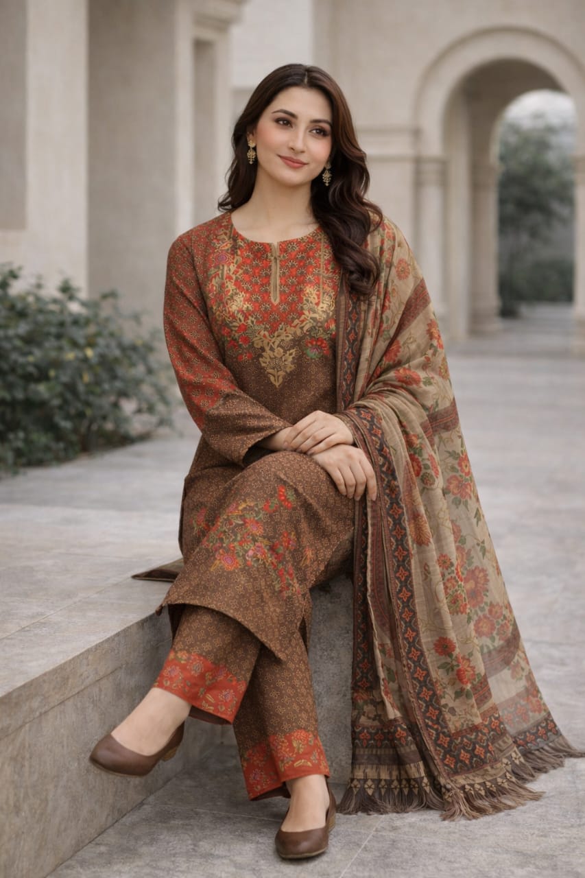• 3 Piece Stitched Suit (Shirt + Trouser + Dupatta)