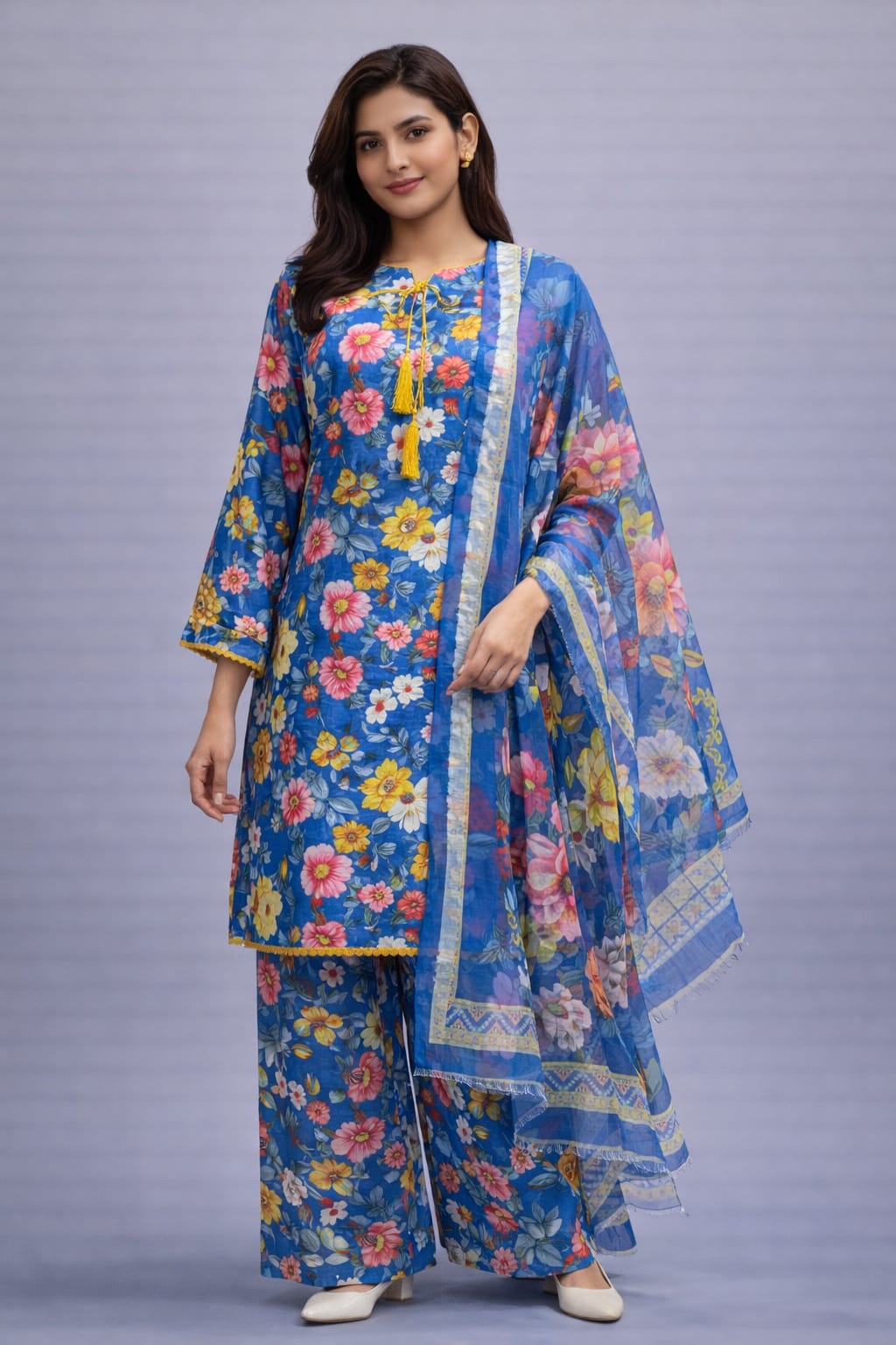 Step into elegance with the Floral Blue 3 Piece Farshi Shalwar Suit by Femmi Prets. Designed for modern Pakistani women, this beautifully stitched outfit features a trendy Farshi Shalwar paired with a graceful floral shirt and matching dupatta.